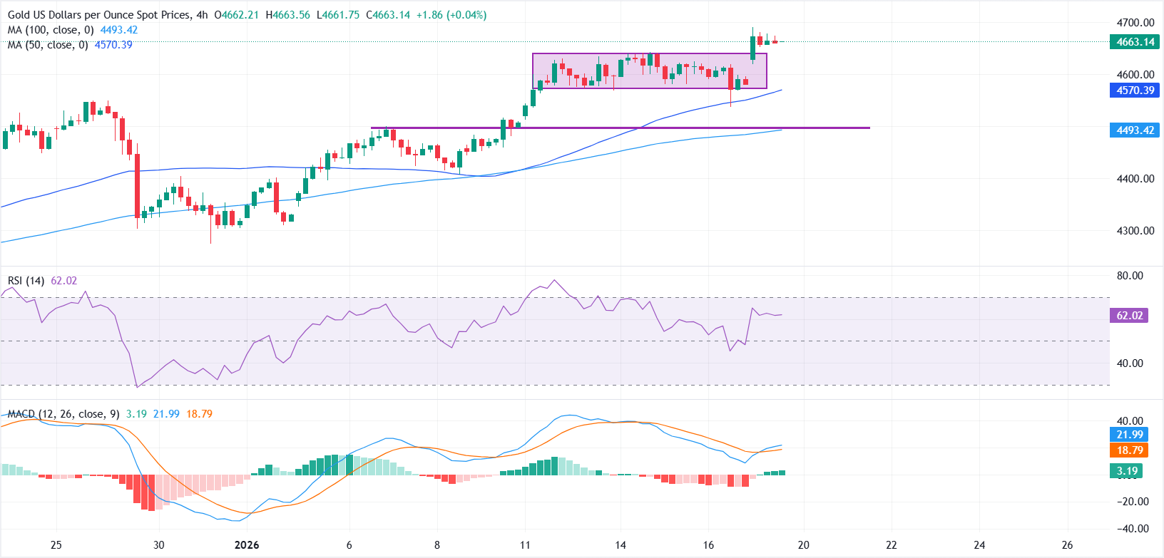 Trên biểu đồ 4 giờ, khoảng trống tăng giá đã giúp XAU/USD vượt qua vùng tích lũy gần đây, với mức kháng cự trước đó gần $4,650 hiện đóng vai trò là mức hỗ trợ tức thời, tiếp theo là đường trung bình động đơn giản 21 kỳ (SMA) quanh mức $4,566.