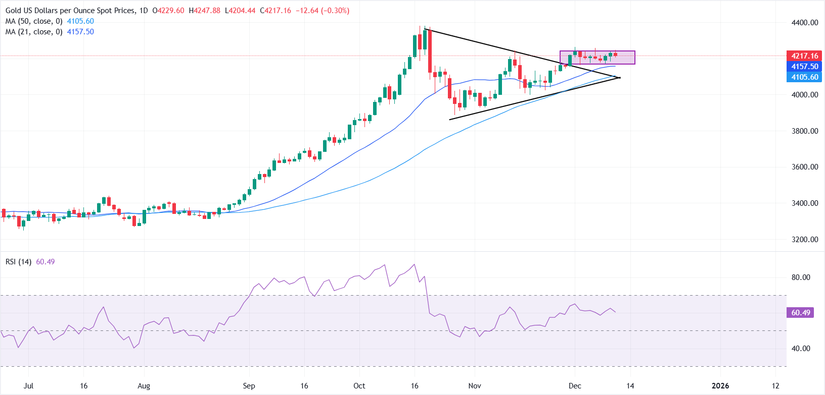 Giá vàng (XAU/USD) vẫn dao động trong phạm vi hẹp, với lực mua vào liên tục xuất hiện ở vùng giá $4,200-$4,180 và áp lực bán liên tục kìm hãm đà tăng gần mức $4,250.