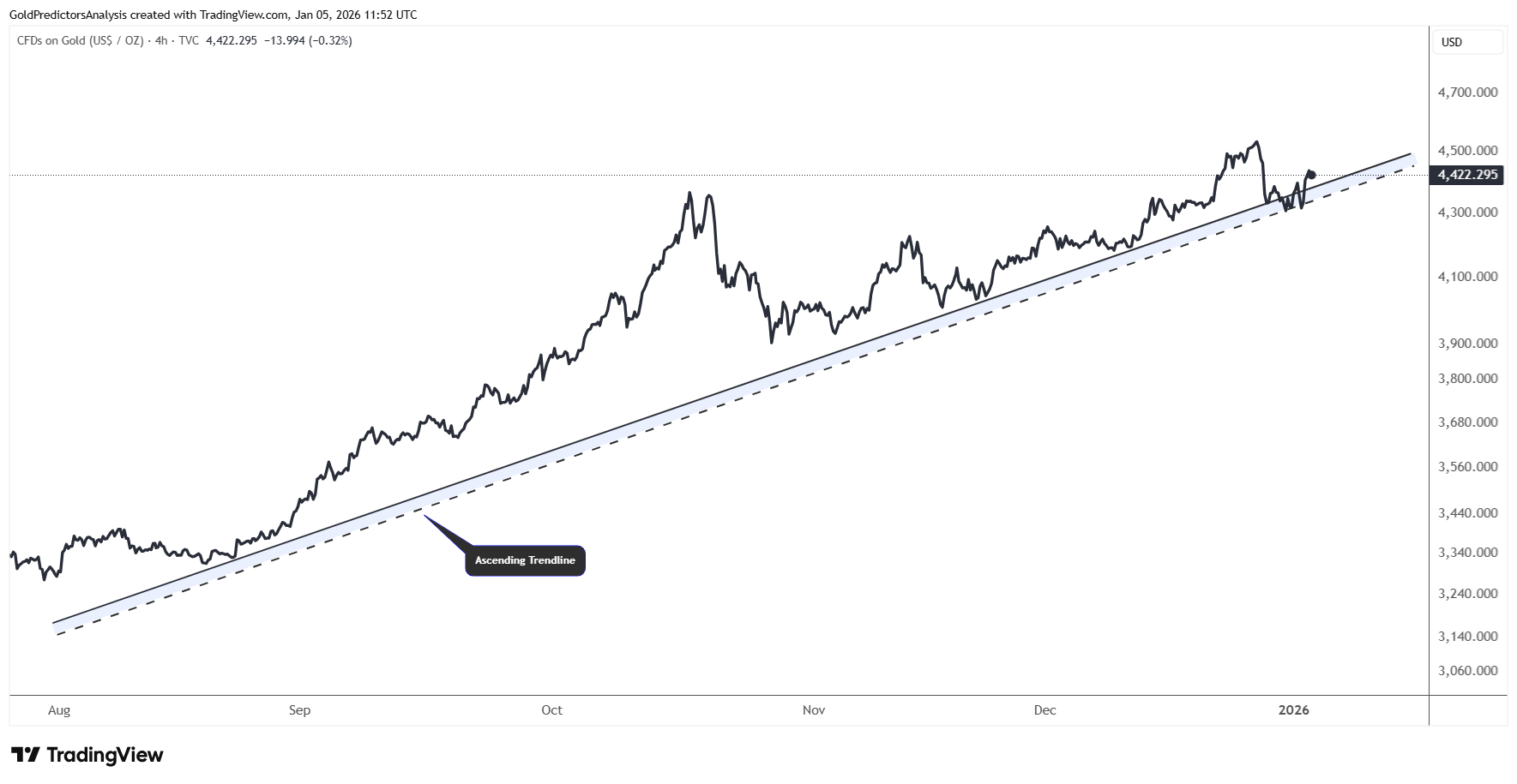 Gần đây nhất, giá vàng đã tăng trở lại trên mức 4.400 đô la, lấy lại đà tăng dọc theo đường xu hướng tăng. Sự phù hợp giữa các yếu tố cơ bản và cấu trúc kỹ thuật vẫn rất chặt chẽ. Chừng nào giá còn giữ vững trên mức hỗ trợ tăng này, xu hướng tăng rộng hơn sẽ vẫn được duy trì. Việc phá vỡ mức đỉnh gần đây có thể mở ra con đường cho sự tăng tốc mạnh hơn nữa.