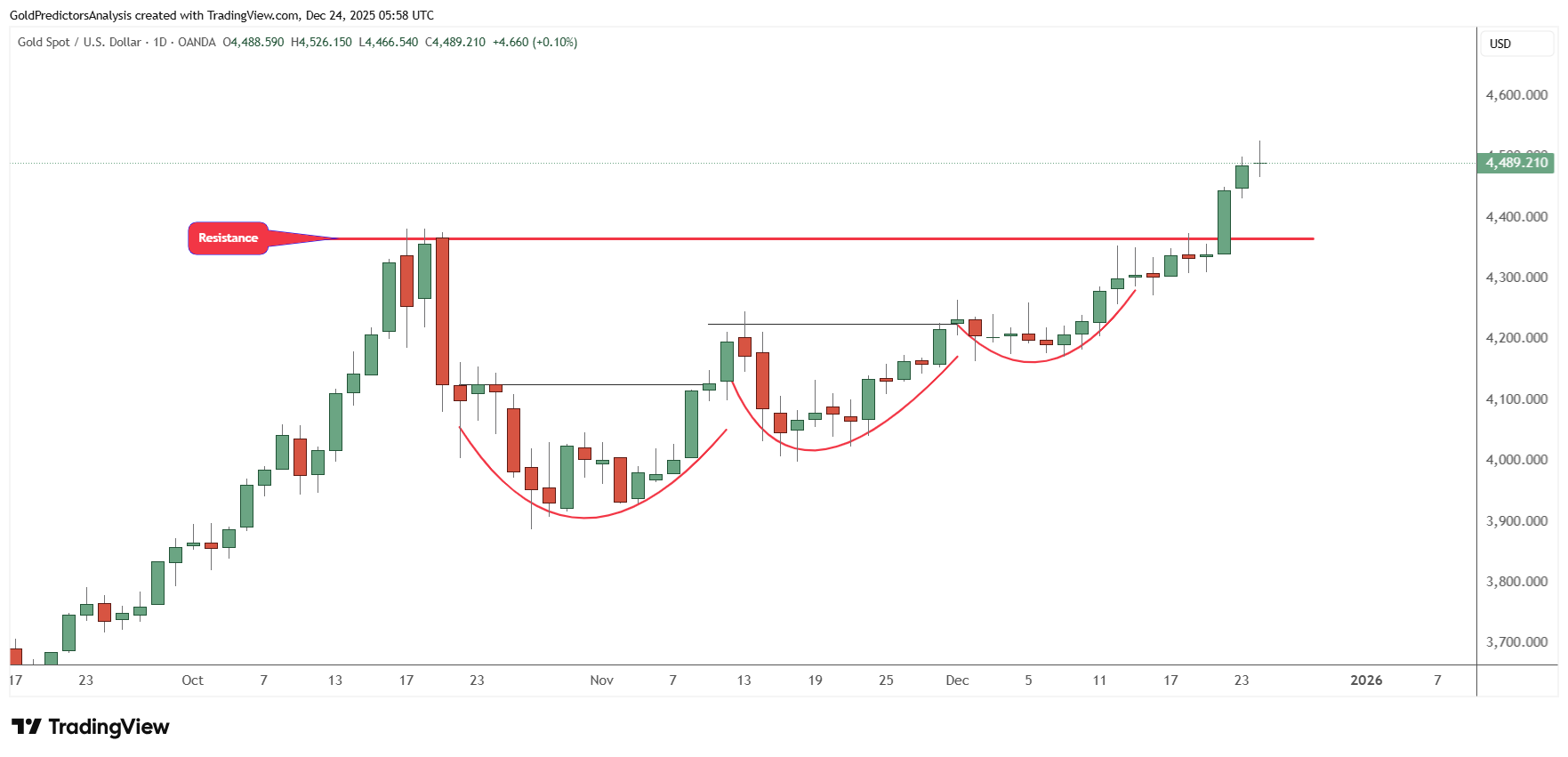 Biểu đồ vàng bên dưới cho thấy một mô hình tiếp diễn tăng giá rõ ràng. Sau đợt tăng mạnh vào tháng 9 và tháng 10, giá đã chạm ngưỡng kháng cự gần 4.400 đô la và hình thành một phạm vi tích lũy rộng. Trong phạm vi này, vàng đã hình thành một loạt ba mô hình hình cốc. Mỗi mô hình đều tạo thành một đáy tròn, phản ánh sự tích lũy ổn định và các đáy cao hơn.
