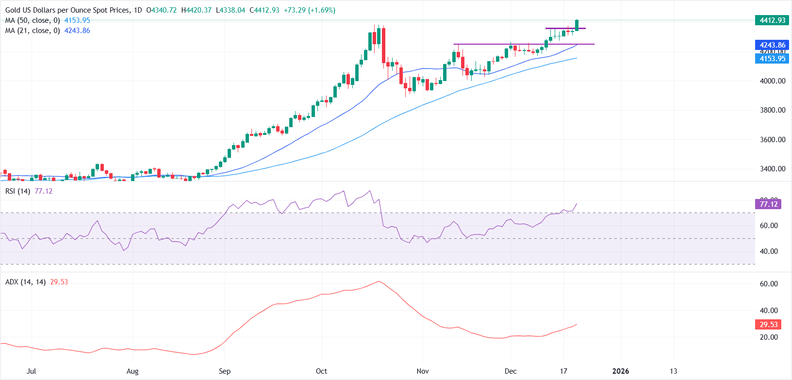 Trên biểu đồ ngày, giá vàng tiếp tục giao dịch ổn định trên đường trung bình động đơn giản 21 ngày (SMA) gần mức 4.244 đô la và đường SMA 50 ngày quanh mức 4.154 đô la, cả hai đều có độ dốc tăng và củng cố xu hướng tăng giá. Chừng nào giá còn giữ vững trên các mức hỗ trợ năng động này, các đợt giảm giá có khả năng thu hút người mua.