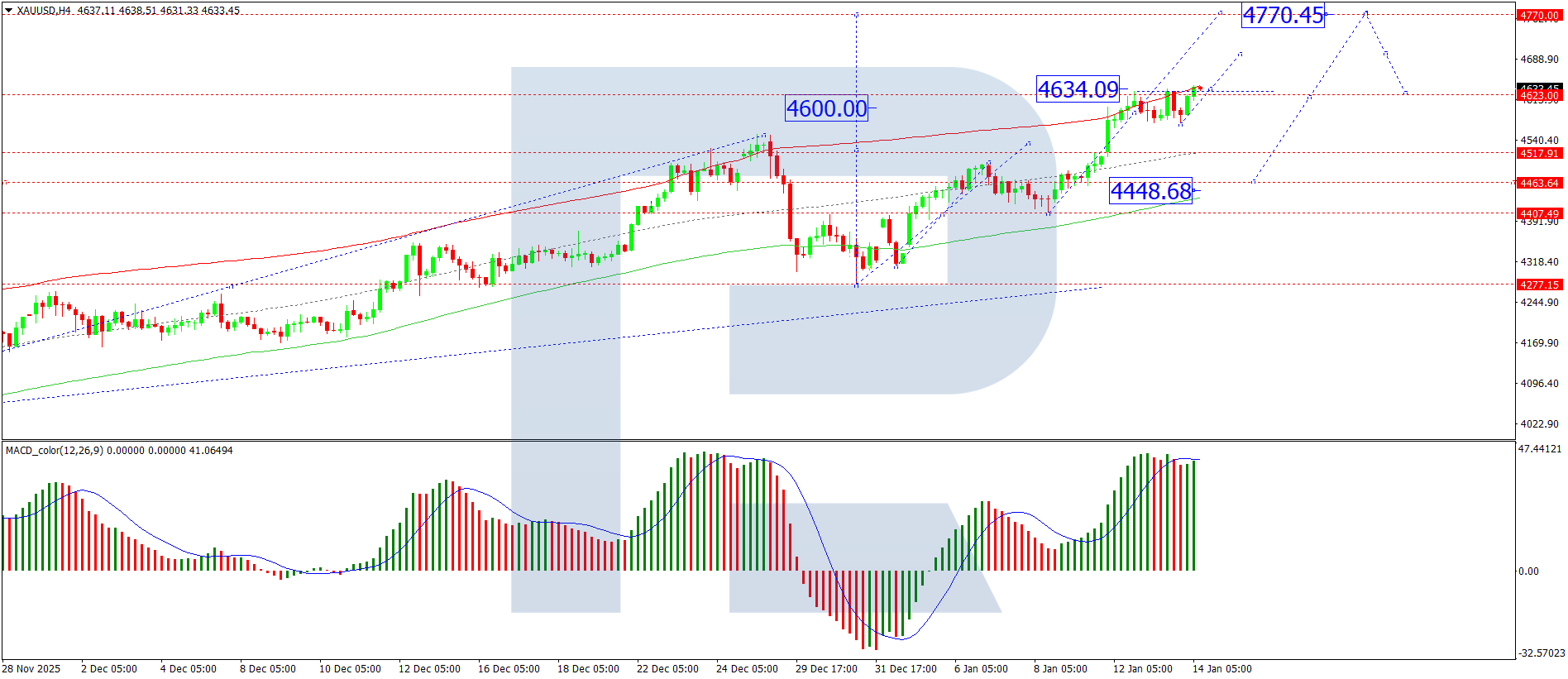 Trên biểu đồ H4, XAU/USD đang củng cố quanh mức 4.623 USD. Dự kiến phạm vi này sẽ mở rộng lên trên hướng tới mức 4.770 USD, có khả năng được theo sau bởi một đợt điều chỉnh giảm về mức 4.620 USD. Nếu phá vỡ dưới mức này, khả năng điều chỉnh giảm sâu hơn về mức 4.520 USD sẽ tăng lên.