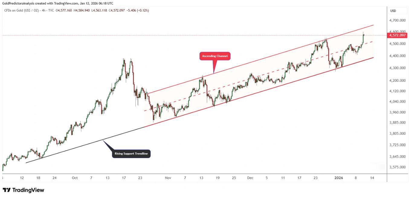 Vào cuối tháng 12, giá vàng tìm thấy điểm hỗ trợ gần rìa dưới của kênh và bắt đầu di chuyển ổn định về phía đường giữa của kênh. Mỗi lần giảm giá trên đường đi đều ngắn ngủi, phản ánh nhu cầu cơ bản mạnh mẽ. Việc vượt qua mốc 4.500 đô la đã xác nhận đà tăng giá mới, với giá hiện đang tiến gần đến vùng kháng cự phía trên của kênh.