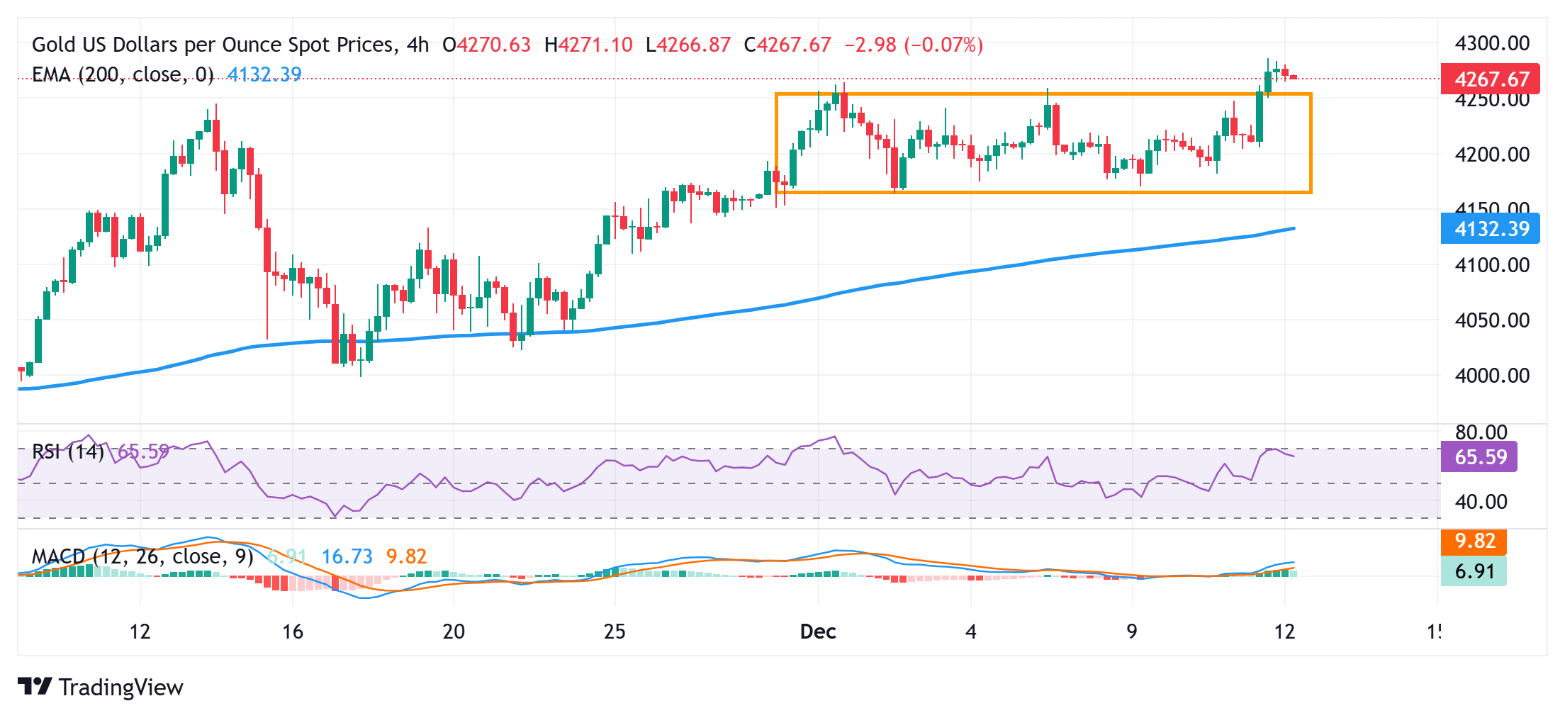 Giá vàng (XAU/USD) tiếp tục đà tăng trong ngày thứ tư liên tiếp và vượt qua mốc 4.300 USD, đạt mức cao mới kể từ ngày 21 tháng 10 trong nửa đầu phiên giao dịch châu Âu hôm thứ Sáu. Đồng đô la Mỹ (USD) gặp khó khăn trong việc thu hút người mua đáng kể và vẫn ở gần mức thấp nhất trong hai tháng, chạm mức hôm thứ Năm, trong bối cảnh triển vọng chính sách tiền tệ nới lỏng của Cục Dự trữ Liên bang (Fed) . Điều này được xem là yếu tố chính tiếp tục thúc đẩy dòng vốn đổ vào kim loại quý màu vàng không sinh lời này.