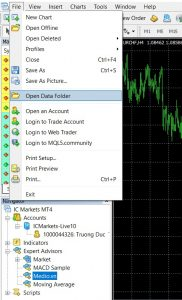 Anh em cần copy file EA. Sau đó mở MT4 lên, chọn File, chọn tiếp Open Data