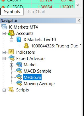 EA anh em vừa copy sẽ xuất hiện trong cửa sổ như ví dụ phía trên (trong ví dụ là EA có tên Medio.vn). Nếu đã copy mà chưa thấy hiện, anh em nên tắt MT4 và khởi động lại.