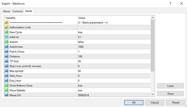 Phần chỉnh sửa thông số này sẽ khác nhau một chút dựa vào từng loại EA khác nhau. Anh em có thể tham khảo ví dụ về EA Medio.vn như trong ví dụ dưới đây để dễ hình dung:
