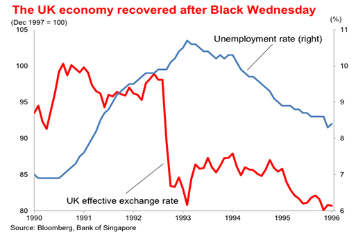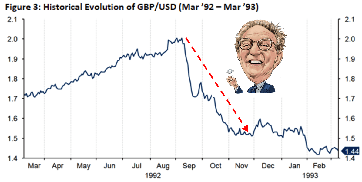Vào cuối năm 1990, điểm yếu của Anh bộc lộ khi Đức thống nhất và George Soros nhận ra đồng Bảng Anh không thể trụ lâu ở mức giá cao như vậy được. Ngoài ra, Bảng Anh lên giá càng khiến xuất khẩu của Anh sụt giảm và nhập khẩu tăng, tỷ lệ thất nghiệp cũng tăng lên trầm trọng.