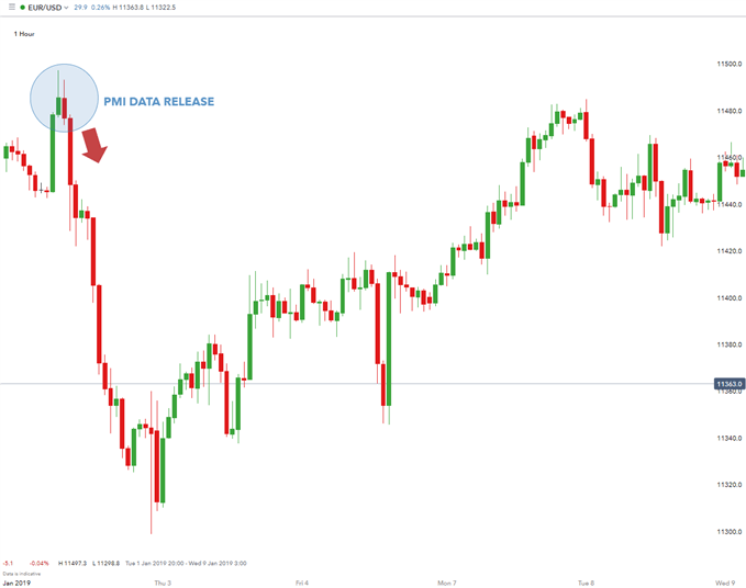 Ta cùng xét 1 ví dụ về cặp giao dịch EURUSD, hãy chú ý khi tin tức về PMI được công bố (tăng cao hơn so với tháng trước ở mức 54,9). PMI tốt hơn mong đợi đã kích hoạt một sự gia tăng của đồng đô la Mỹ so với đồng Euro. Khi một bản tin kinh tế được công bố và đánh bại kỳ vọng, những bước giá mạnh mẽ có thể xảy ra. Ngay sau khi dữ liệu này được công bố thì giá trị đồng USD sẽ tăng rất mạnh, khiến tỷ giá EURUSD giảm đột ngột. Trong trường hợp này, EUR/USD đã giảm 150 pips trong vài giờ.
