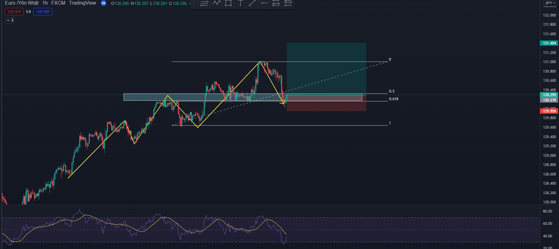 Trong giao dịch để tìm ra vị thế giao dịch đẹp là một chuyện nhưng biết vị trí thoát lệnh ở đâu cũng làm một vấn đề quan trọng không kém. Rất may mắn là anh em hoàn toàn có thể sử dụng Fibonacci và RSI để tìm ra điểm thoát lệnh hiệu quả. Cùng xem ví dụ dưới đây nhé: