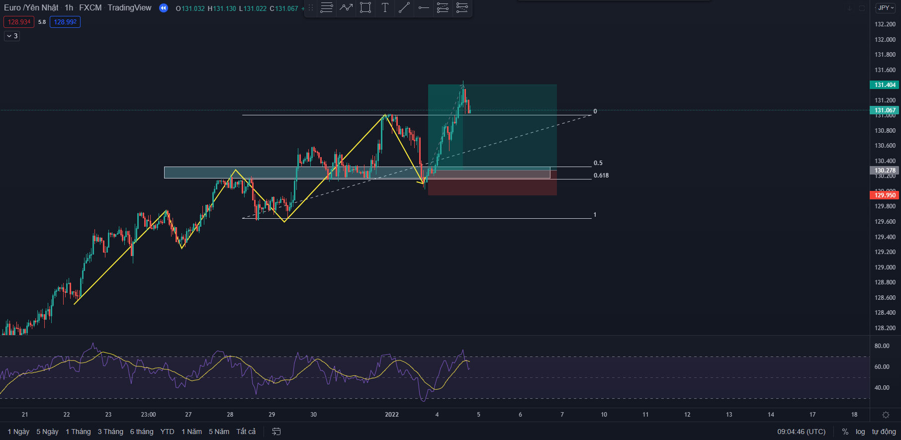 Ngoài cách giao dịch ở một khung thời gian anh em cũng hoàn toàn có thể giao dịch đa khung thời gian kết hợp giữa Fibonacci và RSI. Anh em cùng xem ví dụ sau để hiểu rõ hơn nhé: