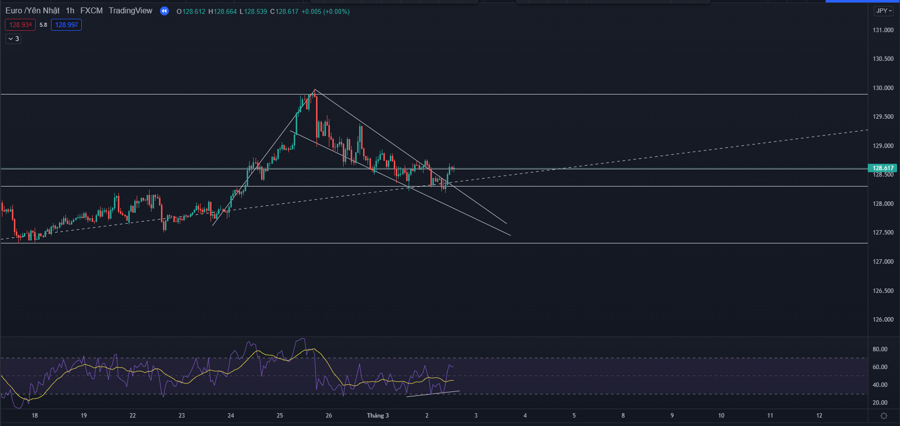 - Đi vào khung thời gian nhỏ hn anh em có thể thấy giá đang hình thành mô hình nêm giảm đã bị phá lên trên kết hợp với RSI đang quá bán và đã có tín hiệu phân kỳ. Anh em hoàn toàn có thể vào lệnh sau khi đóng nến vượt qua đượt cạnh trên của nêm và đặt target ngay tại đỉnh cũ