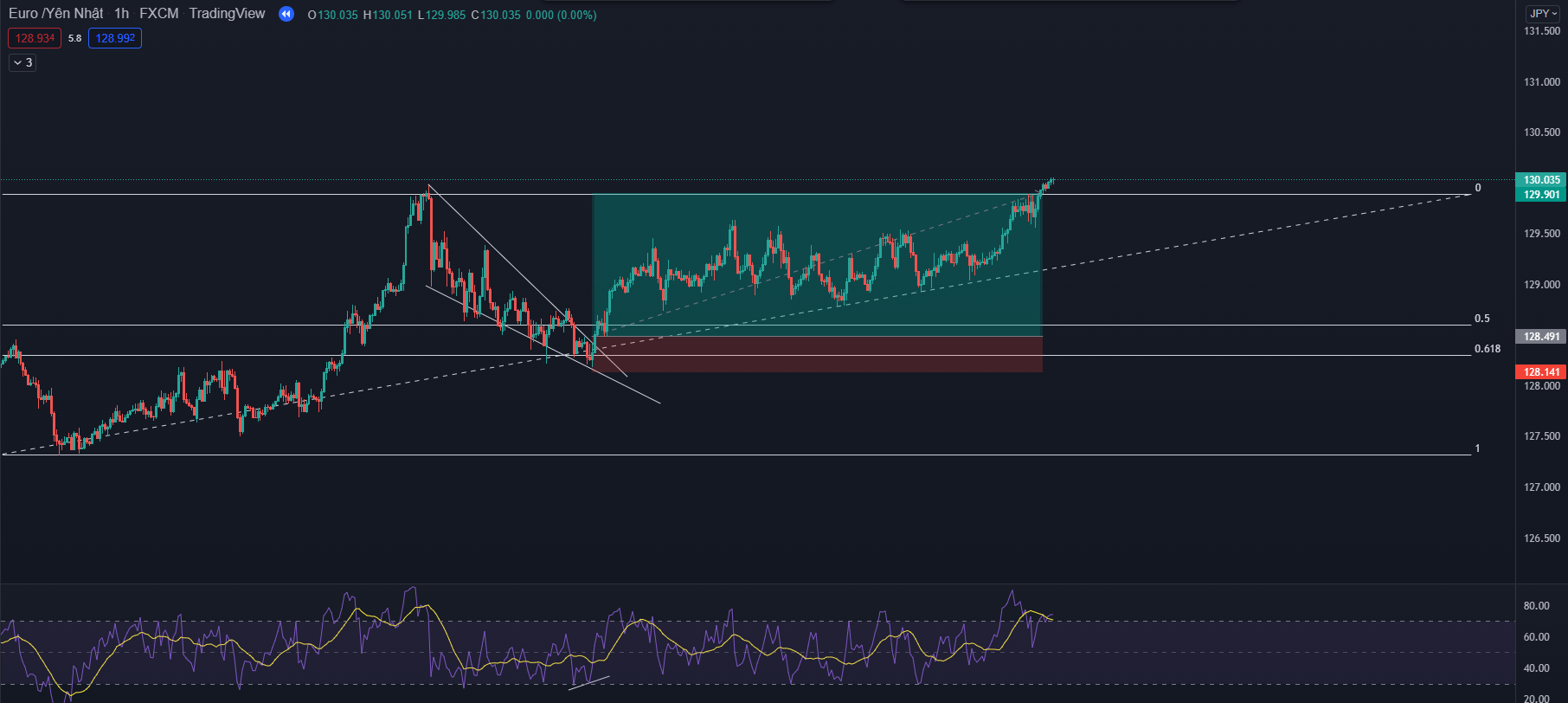 - Bây giờ chúng ta sẽ có thể một indicator để bổ trợ nữa chính là RSI. Anh em có thể quan sát ngay tại thời điểm giá hồi về vùng đỉnh cũ hợp lưu với vùng fibo 0.5-0.618 đồng thời chỉ số RSI cũng cho dấu hiệu quá bán. Lúc này chúng ta có thể dự đoán khoảng 70% xu hướng hồi có thể kết thúc tại đây