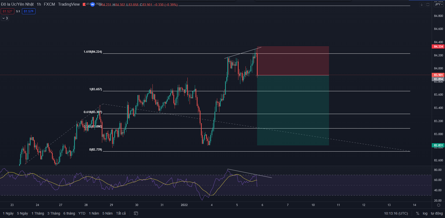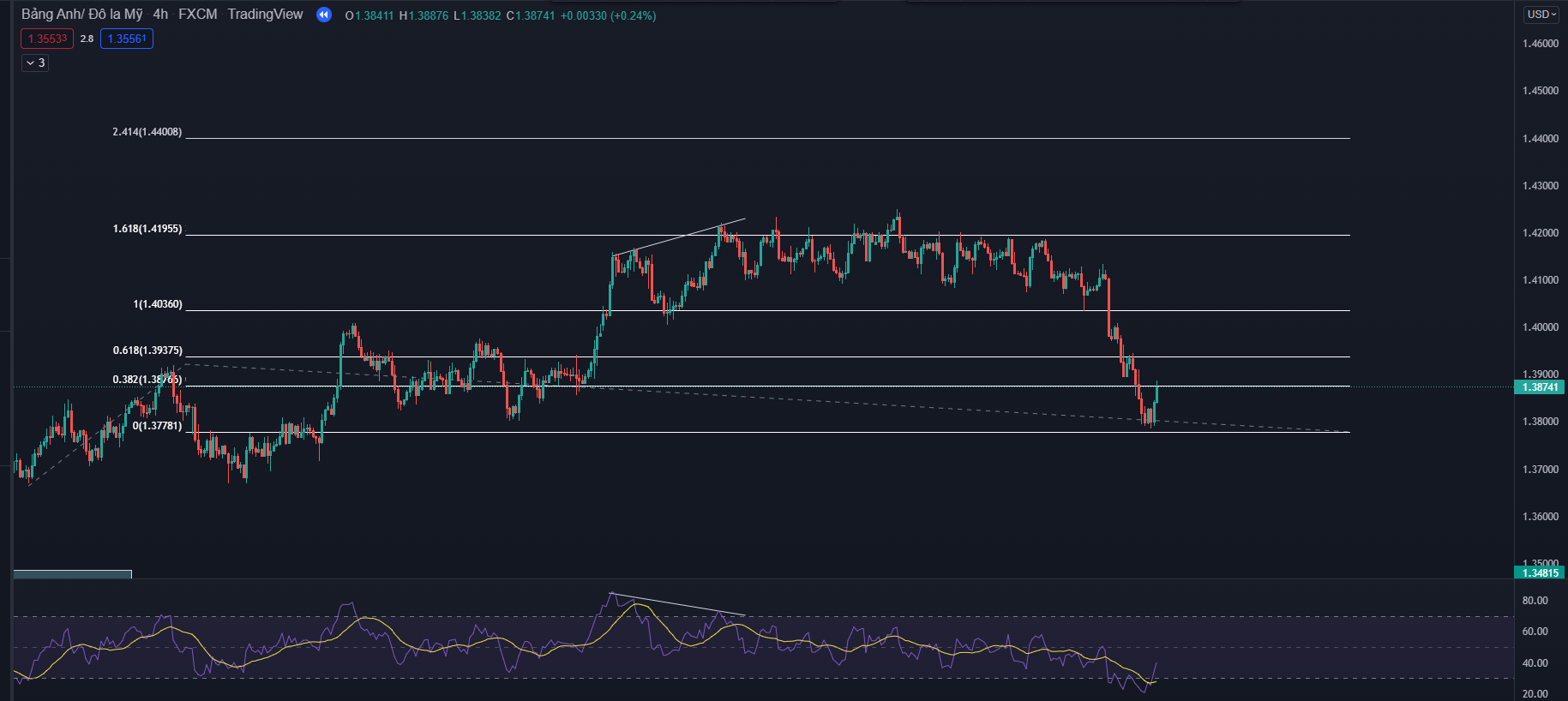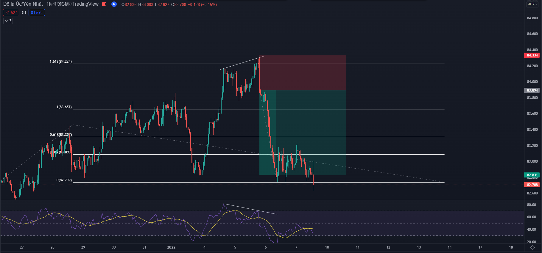 Fibonacci là một công cụ tuyệt vời để đo được sóng hồi sẽ di chuyển và kết thúc ở đâu. Tuy nhiên nếu anh em chỉ dựa trên các vùng quan trọng như 50-61.8 để dự đoán sóng hồi đã kết thúc thì sẽ hơi bị chủ quan. Vì thế chúng ta nên có thêm một chỉ báo đo động lượng hiệu quả như RSI để bổ trợ thêm cho góc nhìn của chúng ta. Sự bổ sung này sẽ giúp anh em bớt chủ quan hơn qua đó giúp gia tăng thêm sự chắc chắn của vị thế giao dịch khi vào lệnh.
