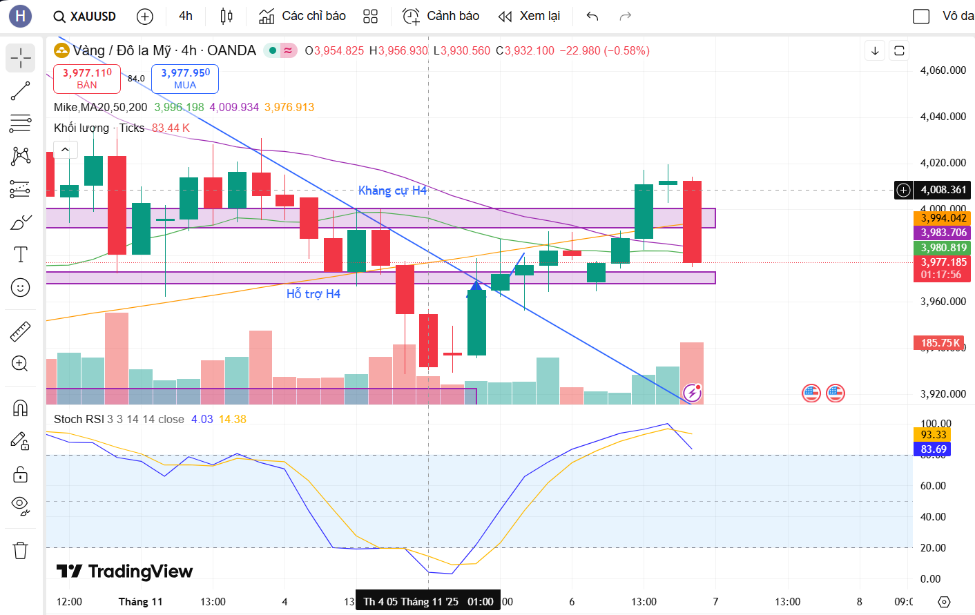 Vào thời điểm cuối ngày, thị trường Vàng (XAU/USD) trên khung H4 đang chứng kiến một đợt bán tháo mạnh mẽ sau cú "Bull trap" điển hình tại vùng kháng cự tâm lý 4000. Giá hiện giao dịch quanh mức 3932.100, chịu áp lực từ cây nến giảm thân dài bao trùm toàn bộ đà tăng trước đó, đi kèm khối lượng giao dịch tăng vọt xác nhận lực bán áp đảo.