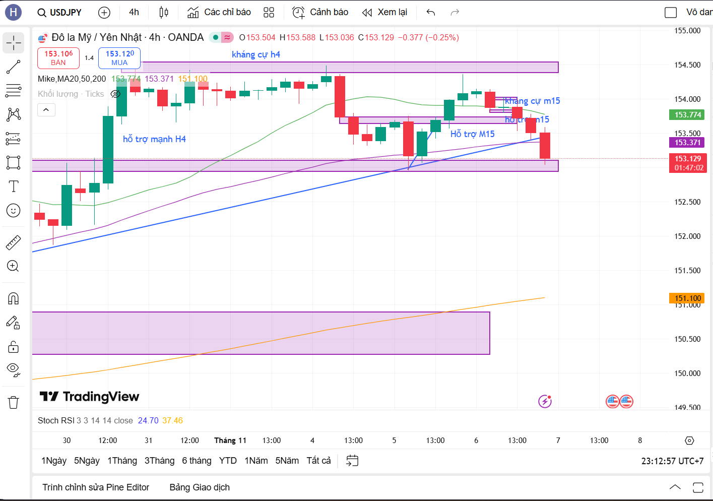 Vào cuối ngày, tỷ giá USD/JPY trên khung H4 đang chịu áp lực điều chỉnh giảm mạnh, hiện giao dịch quanh mức 153.129 sau khi thất bại trong việc chinh phục vùng kháng cự cứng 154.500. Cặp tỷ giá đang trực tiếp kiểm định vùng hỗ trợ trọng yếu 152.800 - 153.100