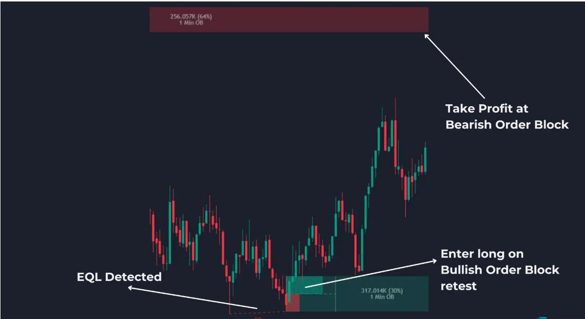 Đáy Bằng (EQL) được sử dụng trong các chiến lược với các mô hình hành động giá khác. Một chiến lược phổ biến là sử dụng Đáy Bằng (EQL) với . Đáy Bằng cho thấy sự chuyển dịch xu hướng thị trường, từ giảm sang tăng, cho phép các nhà giao dịch tìm kiếm điểm vào lệnh dài hạn. Việc kiểm tra lại Khoảng cách Giá trị Hợp lý (FVG) tăng có thể được sử dụng làm điểm vào lệnh sau khi có xác nhận xu hướng. Nhà giao dịch sẽ thoát lệnh khi đạt đến các mức quan trọng như khối lệnh giảm, mức kháng cự hoặc thanh khoản bán.