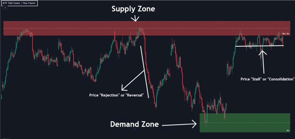 Vùng cung và cầu là những khu vực trên biểu đồ giá do nhà giao dịch xác định, nơi giá có khả năng chững lại hoặc đảo chiều.
