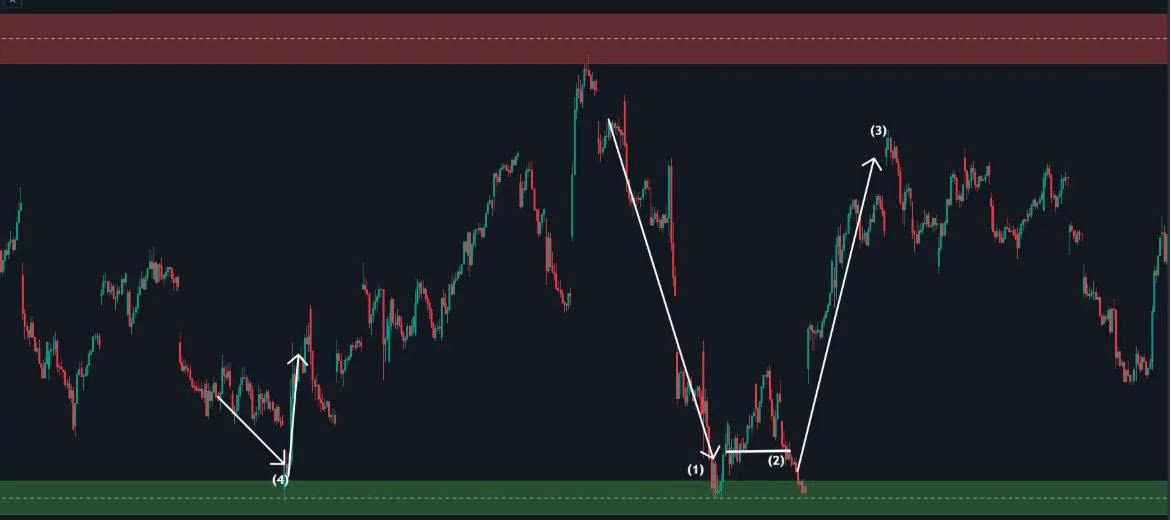 (4) Nếu khối lượng (áp lực) của chuyển động đi vào vùng không đủ lớn thì giá sẽ ngay lập tức bị từ chối (đảo ngược) và không có sự củng cố giá (đình trệ) nào xảy ra.
