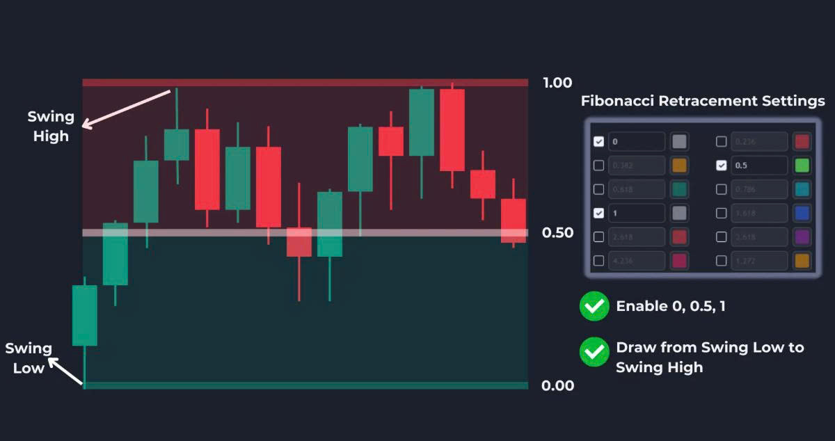 Để làm điều này, chúng ta sẽ sử dụng công cụ Fibonacci Retracement. Trước khi neo điểm trên biểu đồ, chúng ta cần cấu hình công cụ Fibonacci để sử dụng nó đúng cách. Vô hiệu hóa tất cả các đường Fibonacci ngoại trừ 0, 0,5 và 1. Bây giờ, bạn có thể neo điểm đầu tiên tại đáy dao động và điểm thứ hai tại đỉnh dao động. Vùng giữa 0-0,5 sẽ là vùng giảm giá, trong khi vùng giữa 0,5-1 sẽ là vùng cao cấp.