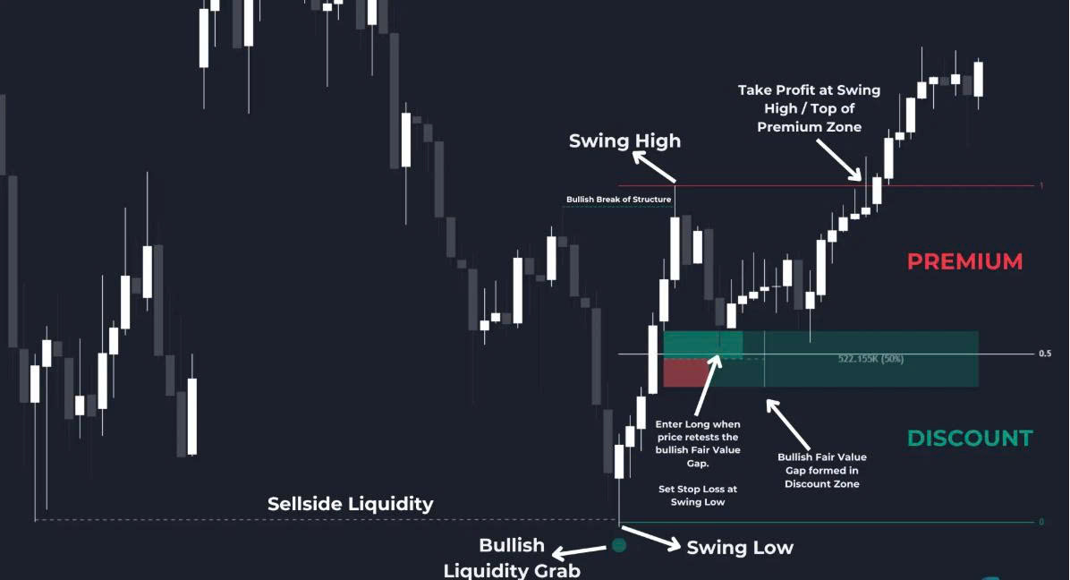 Giờ bạn đã hiểu khái niệm cơ bản về vùng Cao cấp & Giảm giá, chúng ta cần học cách sử dụng hiệu quả khi giao dịch. Kết hợp vùng Cao cấp và Giảm giá với Liquidity Grabs và Fair Value Grap là một chiến lược cực kỳ phổ biến trong giới giao dịch hành động giá. Nếu chúng ta đang tìm kiếm một thiết lập mua hoặc mua, chúng ta nên giao dịch bên trong vùng giảm giá. Nếu chúng ta đang tìm kiếm một thiết lập bán hoặc bán, chúng ta nên giao dịch bên trong vùng cao cấp.