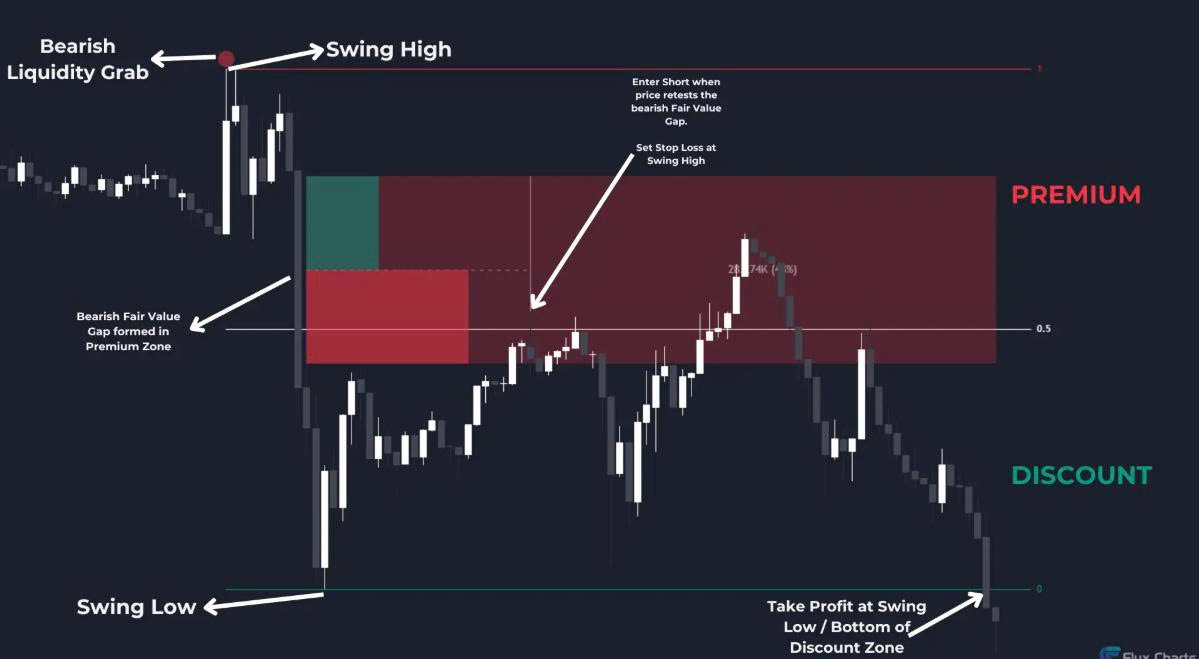 Trong ví dụ giao dịch này, chúng tôi đã kết hợp cả ba khái niệm này để thực hiện một giao dịch bán khống thắng lợi. Thị trường đã đạt mức cao gần đây, hình thành một vùng thanh khoản. Giá đã tăng lên đến vùng này, nắm bắt thanh khoản và nhảy xuống trở lại. Điều này cho chúng ta tín hiệu Nắm bắt thanh khoản giảm giá, báo hiệu chúng ta nên tìm kiếm các cơ hội giao dịch bán khống. Sự nhảy giá này đã hình thành một Khoảng cách giá trị hợp lý (FVG) giảm giá, mà chúng ta sẽ sử dụng làm điểm vào lệnh. Tuy nhiên, trước khi giao dịch FVG này, chúng ta muốn xác nhận rằng nó đang ở trong vùng cao vì chúng ta đang tìm kiếm một giao dịch bán khống. Hãy sử dụng công cụ Fibonacci, sử dụng các thiết lập đã thảo luận ở trên và neo nó từ đáy dao động đến đỉnh dao động. Chúng ta có thể thấy rằng FVG đang ở trong vùng cao. Khi giá tăng lên để kiểm tra lại FVG, chúng ta có thể đặt lệnh dừng lỗ tại đỉnh dao động và chốt lời tại đáy dao động.