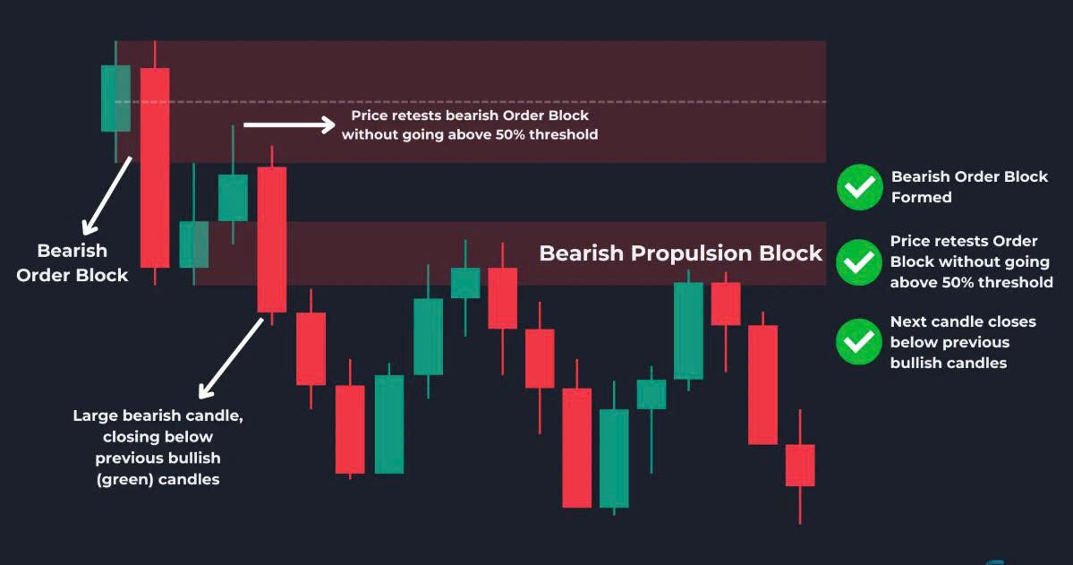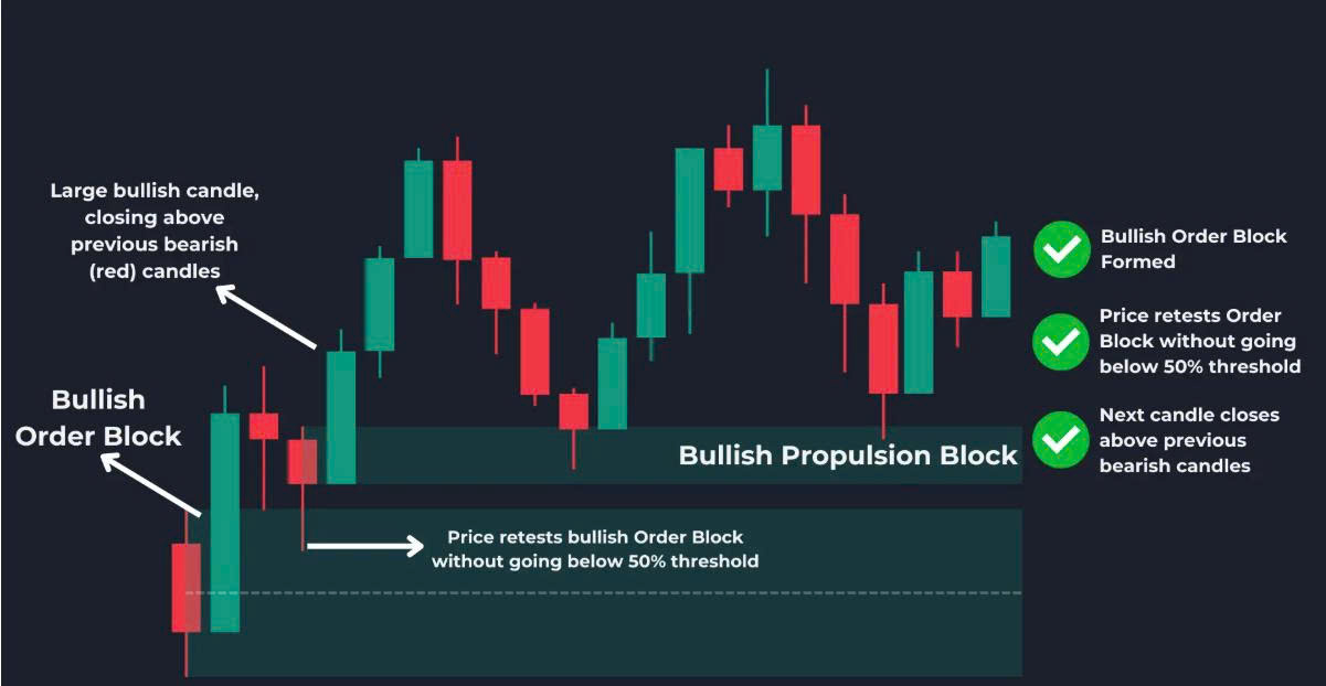 Khối đẩy được hình thành khi nến kiểm tra lại khối lệnh, không vượt qua ngưỡng trên hoặc dưới 50%, sau đó tăng hoặc giảm, đóng cửa ở trên hoặc dưới nến tăng/giảm trước đó.