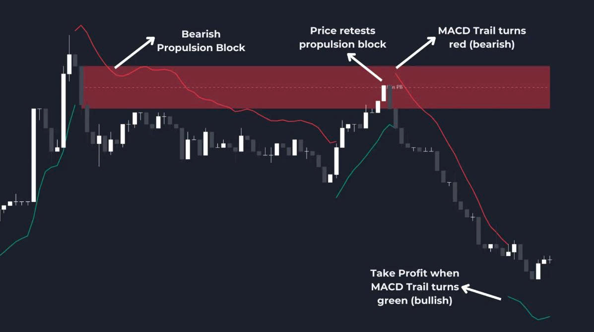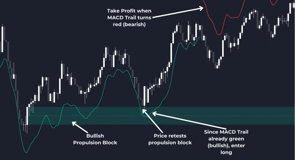 Trong ví dụ giao dịch này, chúng tôi đã kết hợp một Khối Đẩy Tăng giá (Bullish Propulsion Block) với chỉ báo MACD Trail để thực hiện một giao dịch mua thắng lợi. Khi khối đẩy tăng giá hình thành, hãy đợi giá giảm trở lại và kiểm tra lại. Khi giá kiểm tra lại vùng, hãy đợi chỉ báo MACD Trail chuyển sang màu xanh lá cây, tức là tăng giá. Đây sẽ là tín hiệu để vào lệnh mua. Bạn có thể đặt lệnh dừng lỗ bên dưới khối đẩy tăng giá và chốt lời khi Đường mòn MACD chuyển sang màu đỏ. Trong ví dụ này, chúng tôi đã thực hiện được giao dịch với tỷ lệ rủi ro/lợi nhuận là 1:4.