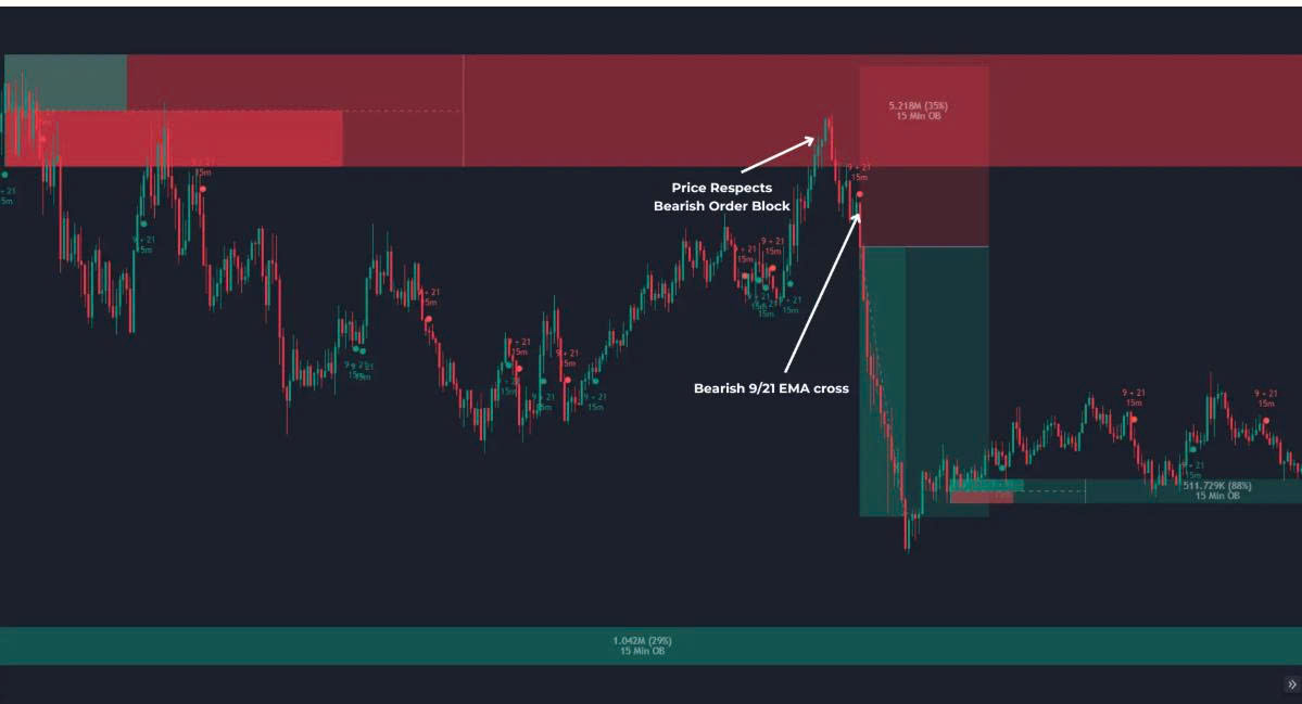 Vì các khối lệnh là những vùng có nhiều lệnh giới hạn chưa được khớp, chúng ta nên giao dịch theo khối lệnh đó, chứ không phải ngược lại. Do đó, khi giá đang kiểm tra lại một khối lệnh tăng giá, bạn chỉ nên tìm kiếm các cơ hội giao dịch mua. Khi giá đang kiểm tra lại một khối lệnh giảm giá, bạn chỉ nên tìm kiếm các cơ hội giao dịch bán. Trong ví dụ này, giá quay trở lại một khối lệnh giảm giá, tôn trọng khối lệnh đó, và theo sau là một đường EMA 9/21 cắt xuống, đây là một tín hiệu đảo chiều giảm giá phổ biến. Điều này cho chúng ta điểm hội tụ tốt để vào lệnh bán, đặt lệnh dừng lỗ phía trên khối lệnh, nhắm đến tỷ lệ rủi ro/lợi nhuận 1:1,5.