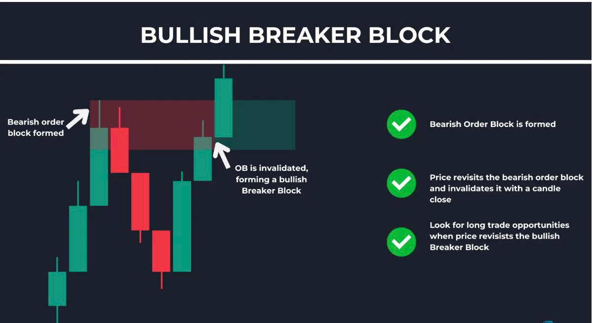 Breaker Block (BB) là một khối lệnh bị vô hiệu. Các vùng này hoạt động tương tự như các ngưỡng kháng cự bị phá vỡ, chuyển thành ngưỡng hỗ trợ. Để hiểu về BB, điều quan trọng là phải hiểu Order Block (OB) là gì. Khi một OB giảm giá bị vô hiệu, nó sẽ chuyển thành một khối phá vỡ tăng giá. Khi một OB tăng giá bị vô hiệu, vùng đó sẽ chuyển thành một khối phá vỡ giảm giá. Các vùng này có thể được sử dụng để phát hiện các điểm đảo chiều tiềm năng của thị trường và cung cấp cơ hội tham gia giao dịch. Nếu bạn chưa quen với khái niệm Order Block, bạn có thể tìm hiểu thêm tại đây.