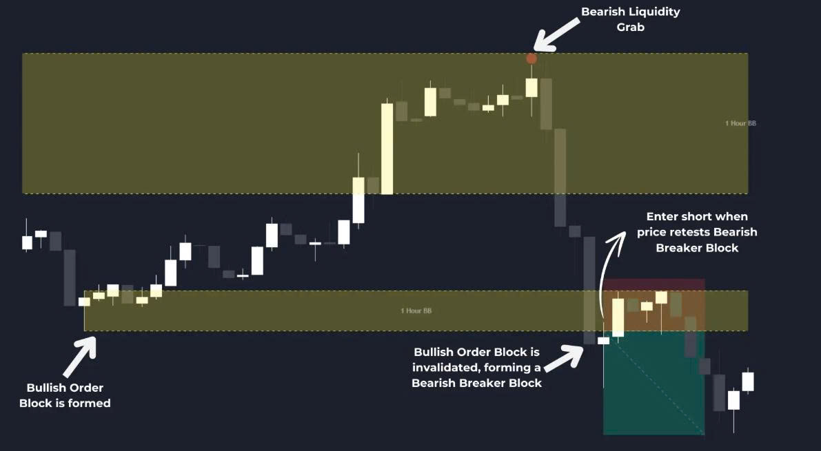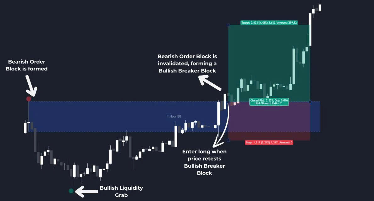 Cách tốt nhất để có kết quả ổn định khi giao dịch với Breaker Blocks là giao dịch theo sự hợp lưu. Bạn không nên vào lệnh chỉ vì giá đang kiểm tra lại Breaker Block. Bạn nên có các hình thức hợp lưu khác để vào lệnh, chẳng hạn như Liquidity Grab, Fair Value Gap, hoặc xác nhận xu hướng thị trường.