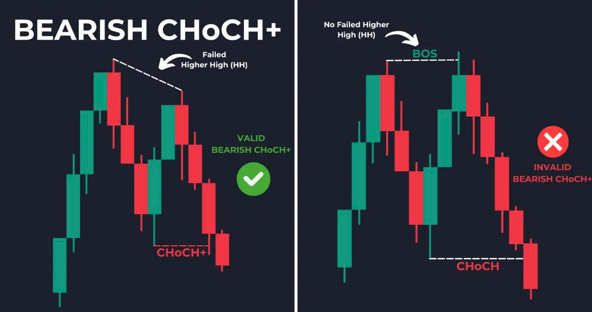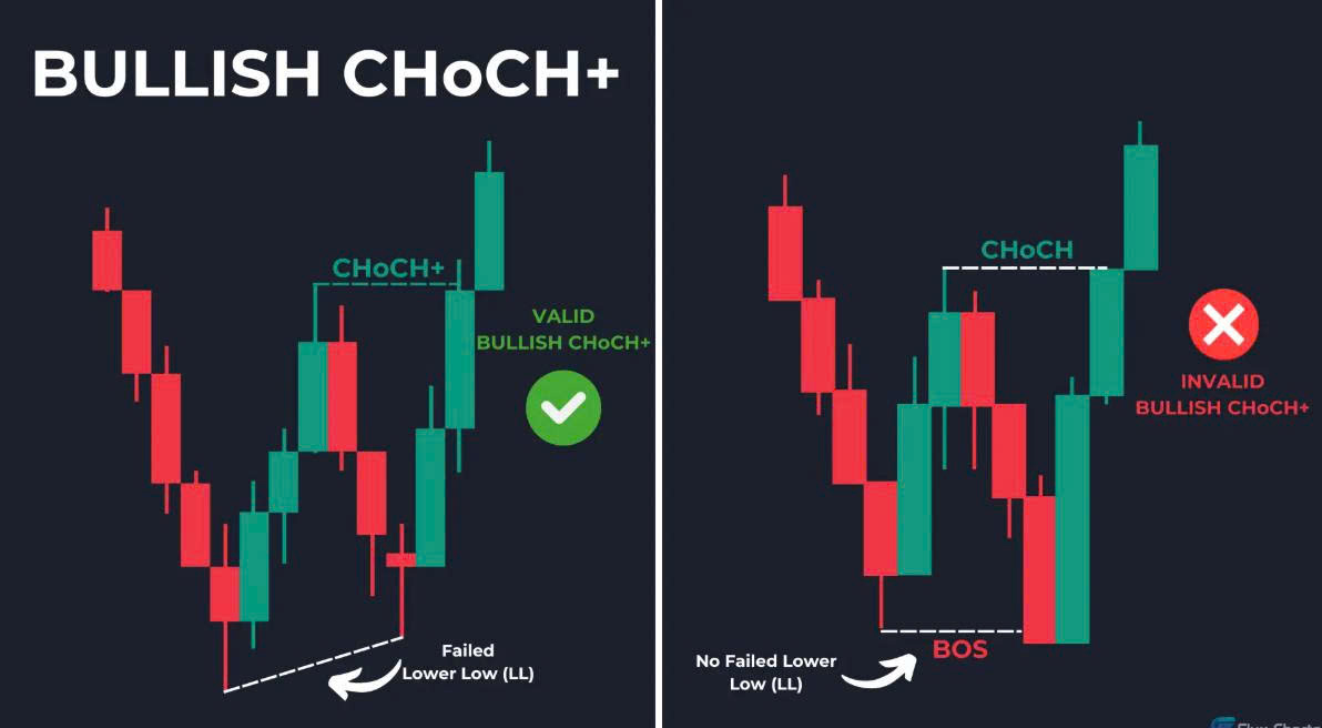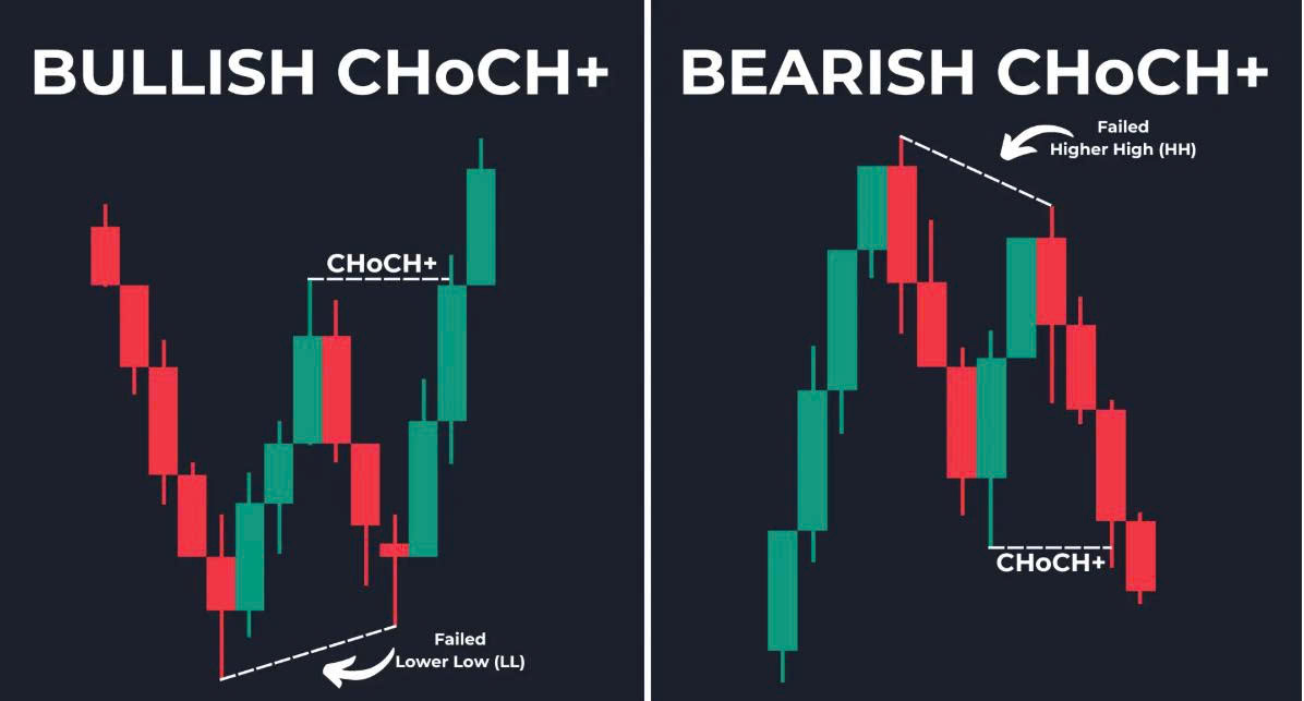 Thay đổi Đặc điểm (CHoCH) xảy ra khi BOS thất bại và giá không thể đạt đến đáy cao hơn (HL) hoặc đỉnh thấp hơn (LH). Thay đổi Đặc điểm Cộng (CHoCH+) xảy ra khi đỉnh cao hơn (HH) và đáy cao hơn (HL) không hình thành hoặc khi đáy thấp hơn (LL) và đỉnh thấp hơn (LH) không hình thành.