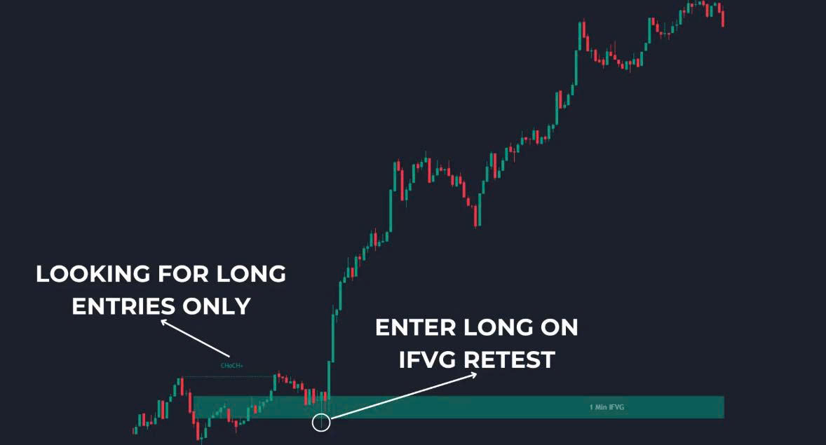 Sau khi mô hình CHoCH+ hình thành, tâm lý thị trường đã thay đổi, và nhà giao dịch có thể có xu hướng thiên về xu hướng. Ví dụ, nếu mô hình CHoCH+ tăng giá hình thành, nhà giao dịch có thể bắt đầu tìm kiếm cơ hội mua. Tốt nhất nên tham gia giao dịch khi giá thoái lui tại các vùng thị trường then chốt như Khoảng cách Giá trị Hợp lý Đảo ngược (IFVG) tăng giá, Khối lệnh (OB) tăng giá, Vùng cầu, v.v. Khi giá thoái lui về các vùng này sau mô hình CHoCH+ tăng giá, bạn có thể mở một vị thế mua, kỳ vọng người mua sẽ tích cực.