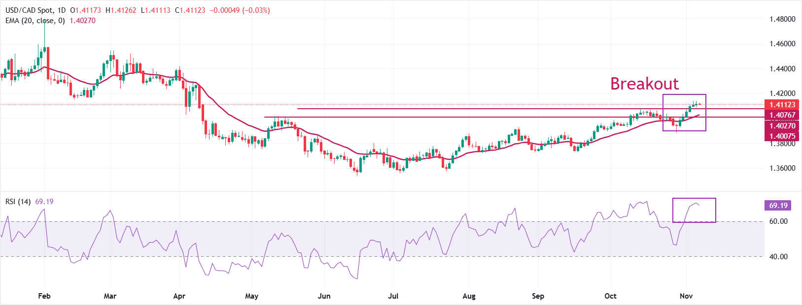 Cặp USD/CAD giao dịch trong biên độ hẹp quanh mức 1,4100 trước khi dữ liệu thị trường lao động Canada được công bố. Nhìn chung, cặp Loonie đang tăng giá khi vượt qua vùng kháng cự trước đó trong khoảng từ 1,4016-1,4080.