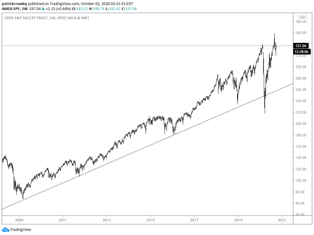 Nhìn vào biểu đồ tuyến tính hàng tuần của SPY bên dưới, với một đường xu hướng. Mức thấp nhất năm 2009 được kết nối với mức thấp nhất năm 2015. Đường xu hướng rõ ràng đã bị phá vỡ vào tháng 3 năm 2020 khi thị trường sụp đổ.