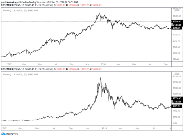 Thứ nhất, biến động của Bitcoin rất lớn. Thị trường Cryptocurrency luôn có biến động lớn gấp nhiều lần so với chứng khoán và Forex, do đó sẽ hợp lý hơn khi sử dụng biểu đồ giá mà thay đổi giá tính theo phần trăm (không phải đơn vị giá).