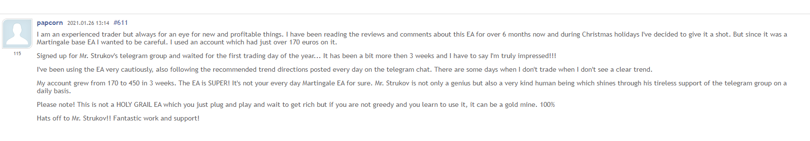 Mình xin lược dịch review của trader có tên papcorn cho các bạn: ” Dù là một trader giàu kinh nghiệm nhưng tôi luôn quan tâm và sẵn sàng trải nghiệm những điều mới mẻ và có lợi nhuận. Sau khi đọc các đánh giá và nhận xét về EA này trong hơn 6 tháng nay nên trong kỳ nghỉ lễ Giáng sinh, tôi đã quyết định thử. Nhưng vì nó là một EA Martingale nên tôi khá cẩn trong khi chỉ sử dụng một tài khoản chỉ có hơn 170 Euro.