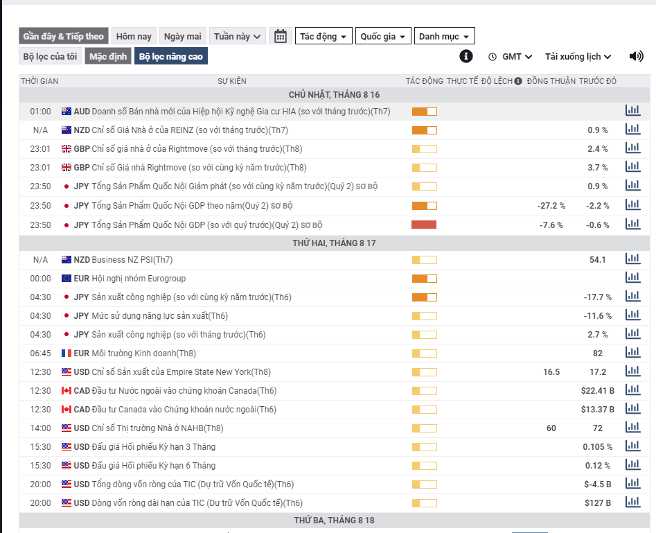 Là một nhà giao dịch trong ngày hay giao dịch lướt sóng, các sự kiện được đánh dấu màu đỏ là những sự kiện bạn cần lưu ý. Biến động xung quanh sự kiện là điển hình và được mong đợi, bất kể dữ liệu được đưa ra bên trên, bên dưới hay phù hợp với kỳ vọng của thị trường.