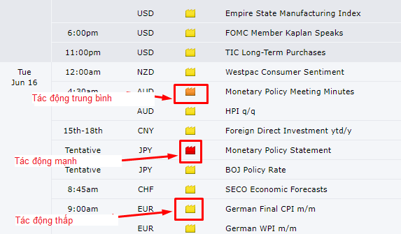 Ví dụ: Tuyên bố chính sách tiền tệ của Ngân hàng Trung ương Nhật Bản có thể có tác động đáng kể đến giá của đồng JPY. Đó là lý do tại sao sự kiện tin tức có điểm đánh dấu màu đỏ hiển thị “Dự kiến có tác động mạnh”. Một trader thiên về đầu tư theo kỹ thuật chỉ cần quan tâm đến một số tin tức có tác động cực mạnh như này mà thôi.