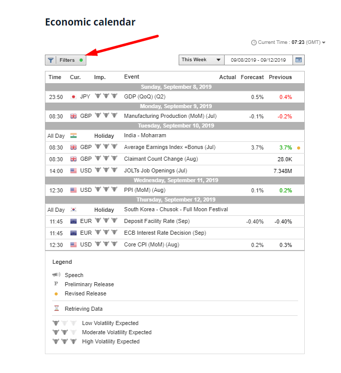 Bạn cũng có thể đặt lịch cho ngày hiện tại, ngày hôm qua hoặc tương lai để xem loại thông tin nào đã hoặc sẽ được phát hành. Đây là một công cụ tuyệt vời khi cố gắng dự báo các chuyển động của thị trường và tận dụng các cơ hội.