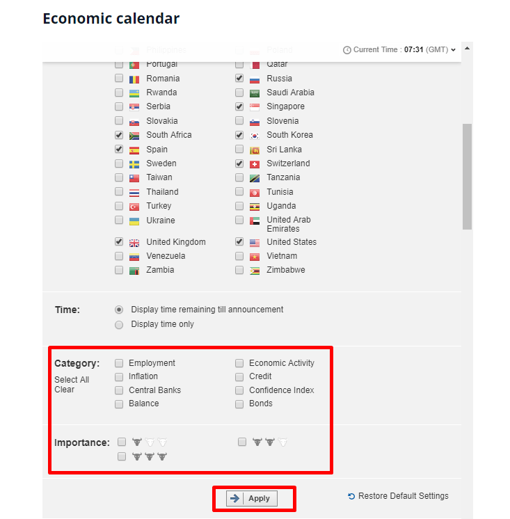 Khi mở lịch kinh tế trên màn hình, bạn có thể nhấp vào nút “Filter” (Bộ lọc) để sắp xếp thông tin bạn muốn dựa trên quốc gia, loại dữ liệu và mức độ quan trọng của dữ liệu sẽ được công bố.
