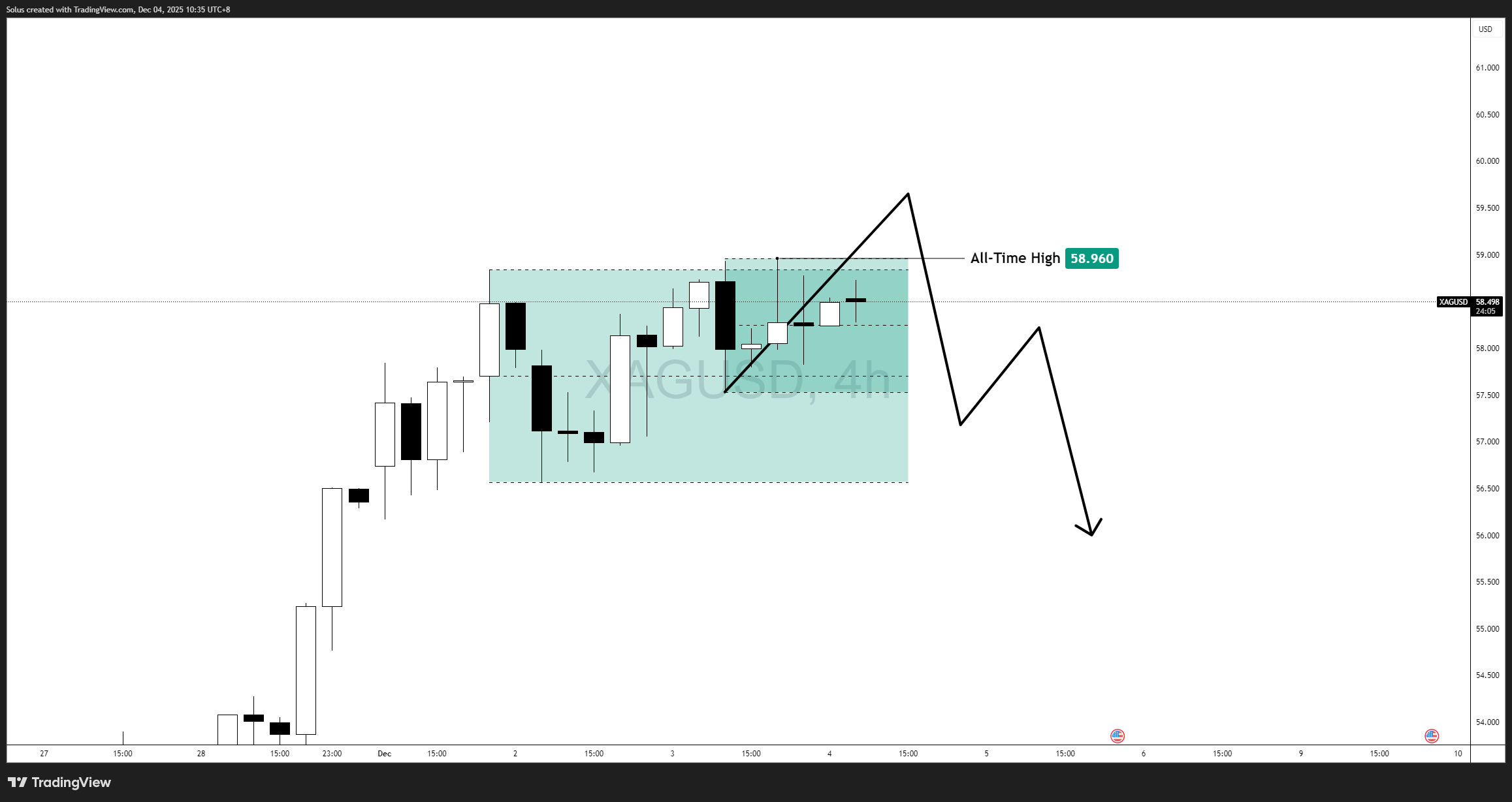 Trong một số phiên giao dịch gần đây, XAGUSD đã tạo ra một cấu trúc parabol mạnh mẽ, vượt qua ngưỡng kháng cự lâu đời và đạt mức cao nhất mọi thời đại mới gần 58,95 đô la .