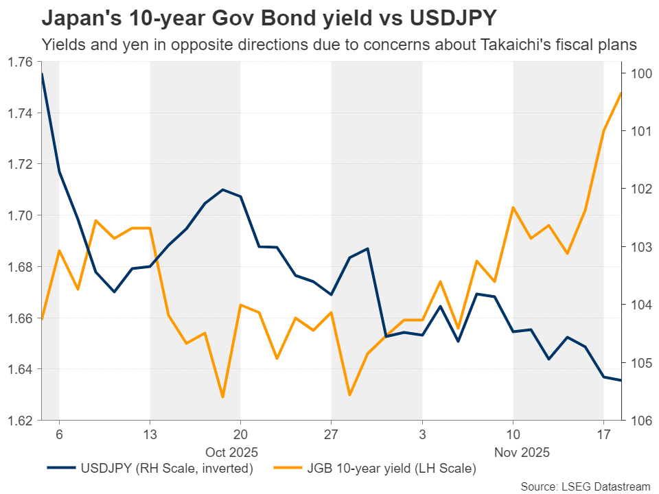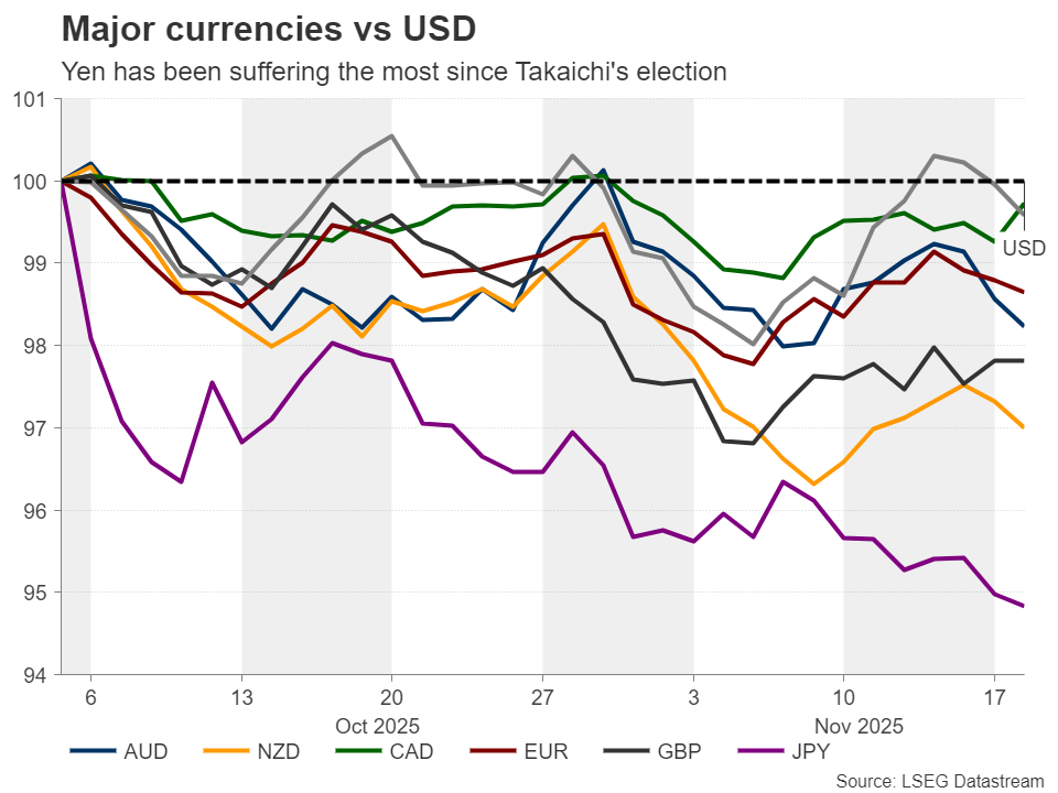 Đồng yên là đồng tiền bị tổn thương nhiều nhất trong số các đồng tiền chính kể từ ngày 4 tháng 10, ngày Sanae Takaichi được bầu làm lãnh đạo mới của Đảng Dân chủ Tự do và sau đó là thủ tướng mới của Nhật Bản.