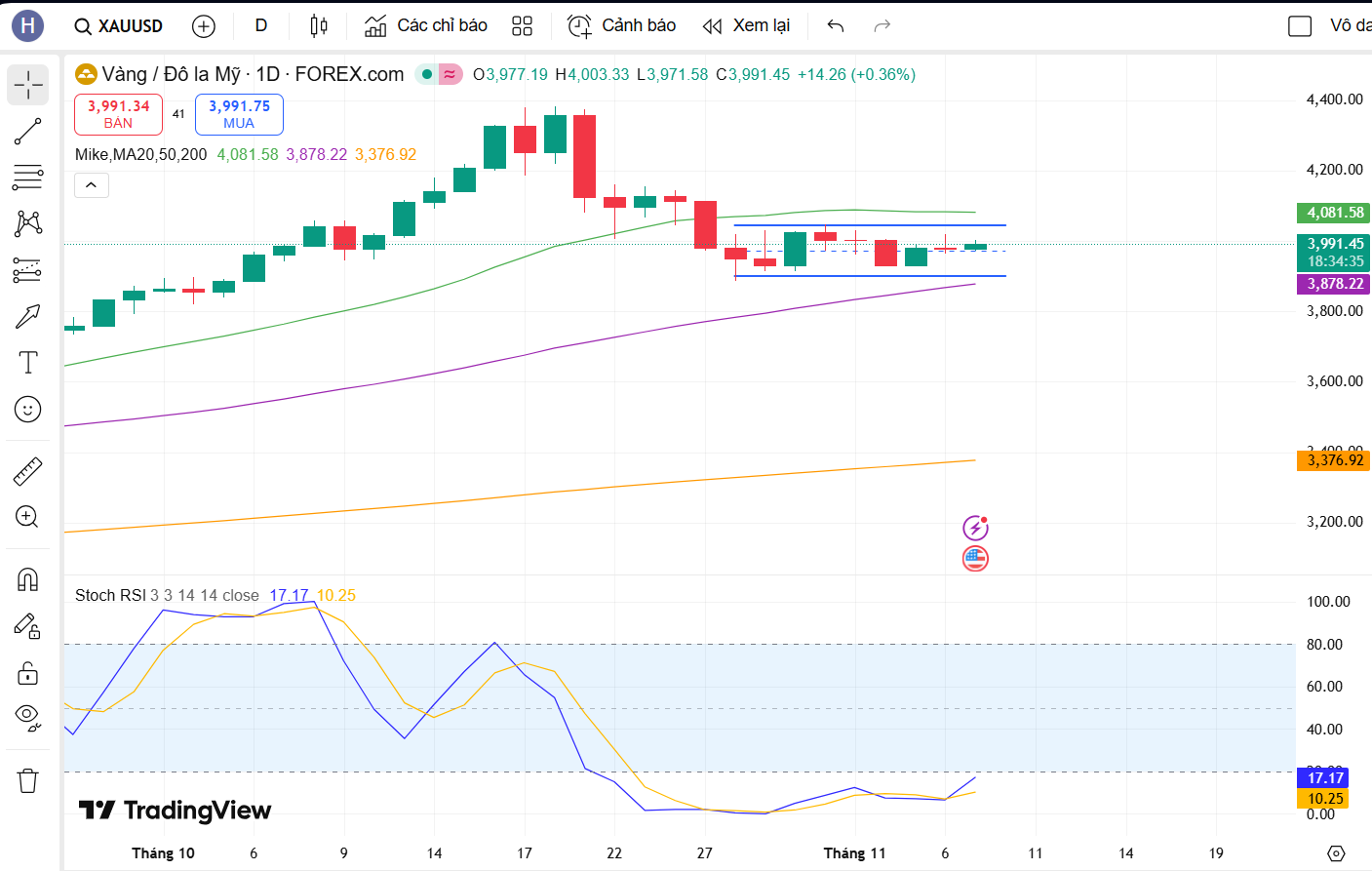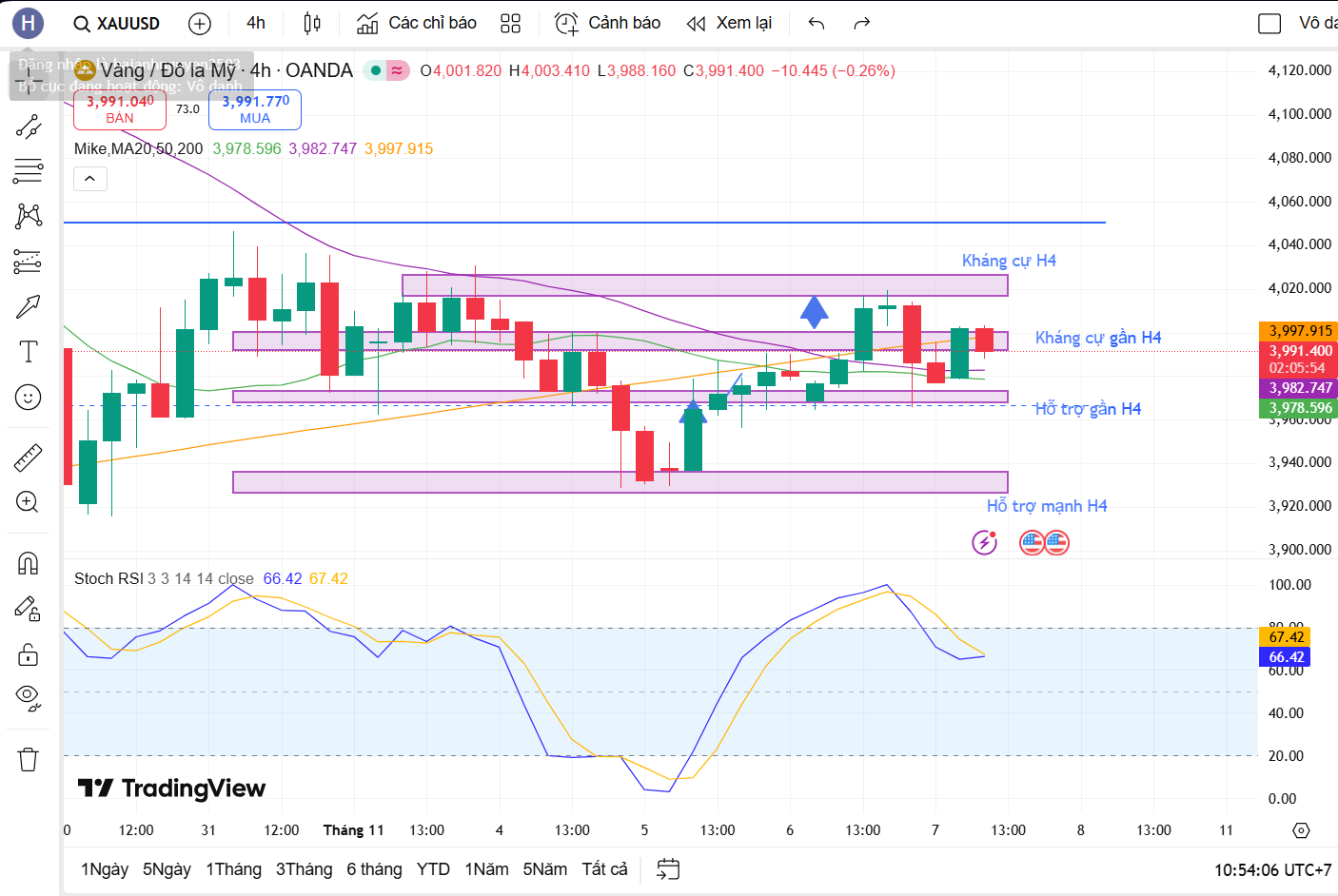 Chuyển sang khung H4, chỉ số đang ở quanh vùng kháng cự gần sau khi có những cây nến bứt phá vào ngày hôm qua. Hiện tại, một vùng kháng cự mới đang có xu hướng dần được hình thành ở trên mức 4020 trong khi vùng hỗ trợ gần cũng đã bị phá vỡ vào ngày 5/11, khẳng định giá vào đang giao động với biên độ rộng. Cần chú ý rằng, các đường MA20 và MA50 đã về dưới đường MA200, cho thấy phe bán đang chiếm ưu thế trong ngắn hạn. Quan điểm này càng được củng cố khi chỉ số Stoch RSI đã và đang thoát khỏi vùng quá bán, báo hiệu cho một xu hướng giảm trong thời gian tới