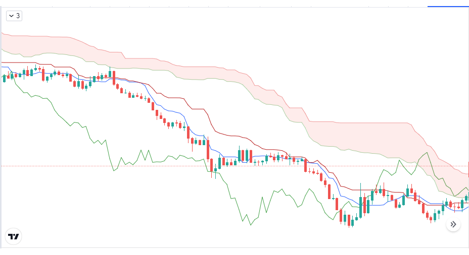 Nếu giá di chuyển dưới đám mây Ichimoku Kinko Hyo màu đỏ, cho thấy thị trường có xu hướng giảm (Downtrend).
