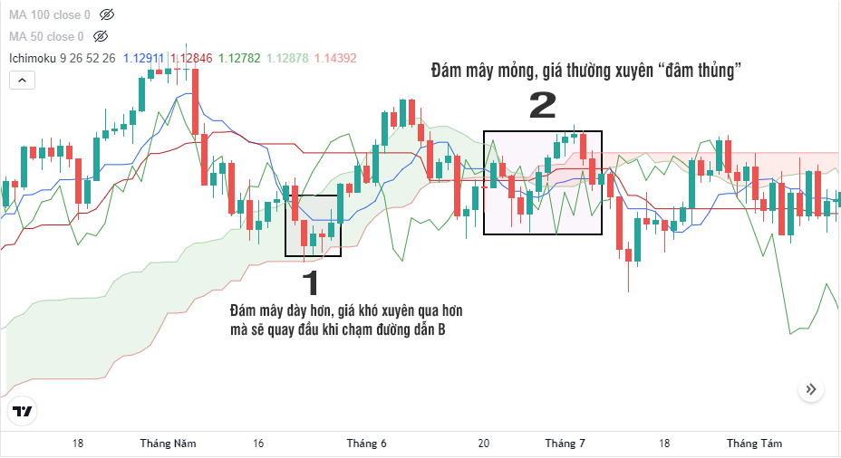 Ngược lại, nếu độ dày đám mây càng mỏng thì vùng hỗ trợ / kháng cự càng yếu, và giá càng dễ đi xuyên qua cả 2 đường dẫn A và B, khó có khả năng đảo chiều, nhưng sự phá vỡ có thể cũng không quá mạnh.