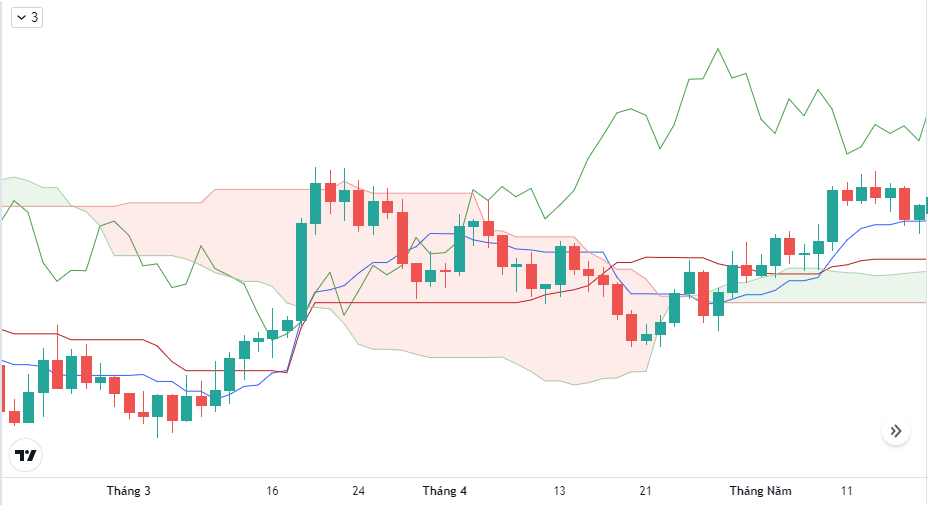 - Chikou Span (Đường trễ) = Giá đóng cửa kỳ hiện tại được vẽ lùi lại 26 kỳ trong quá khứ