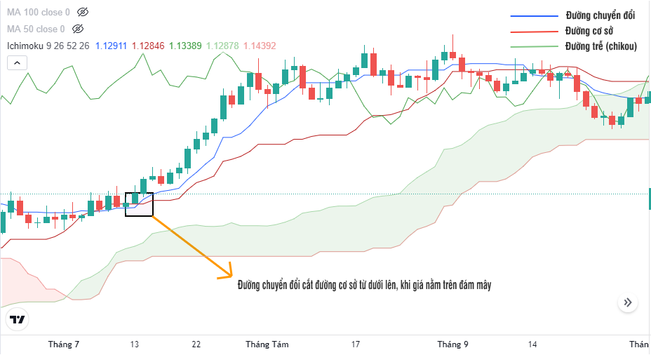 - Nếu đường Tenkan-sen (đường chuyển đổi) vượt lên trên Kijun-sen (đường cơ sở), đó là một tín hiệu mua.