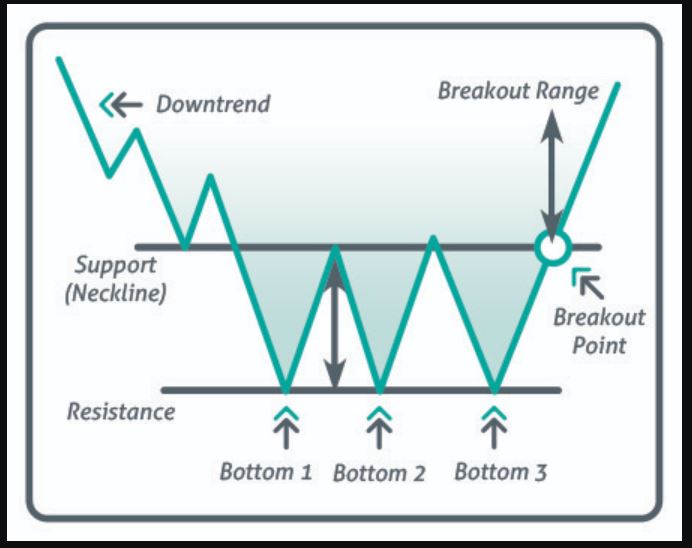 Như tên cho thấy, ba đáy của mô hình thường được tạo ra ở cùng mức giá, hoặc ở những mức tương đương nhau tạo thành 1 đường thẳng tương đối.