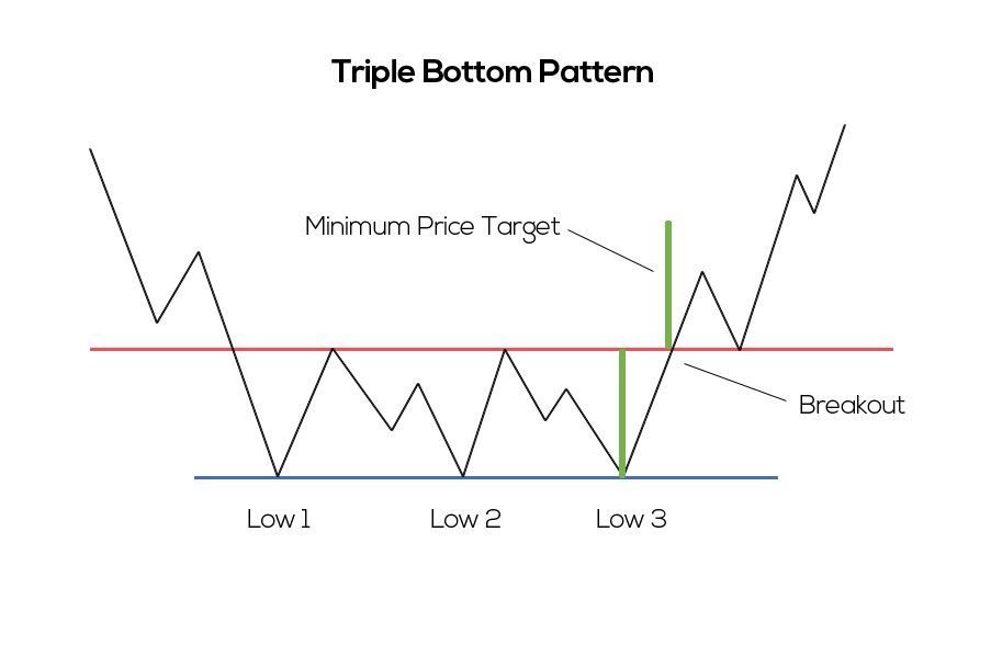 Mô hình 3 đáy là mô hình đảo chiều tăng thường được tìm thấy trên biểu đồ thanh, biểu đồ đường và biểu đồ nến. Có ba mức thấp bằng nhau sau khi vượt qua ngưỡng kháng cự. Là các mẫu đảo chiều chính, các mẫu này thường hình thành trong khoảng thời gian 3 đến 6 tháng.